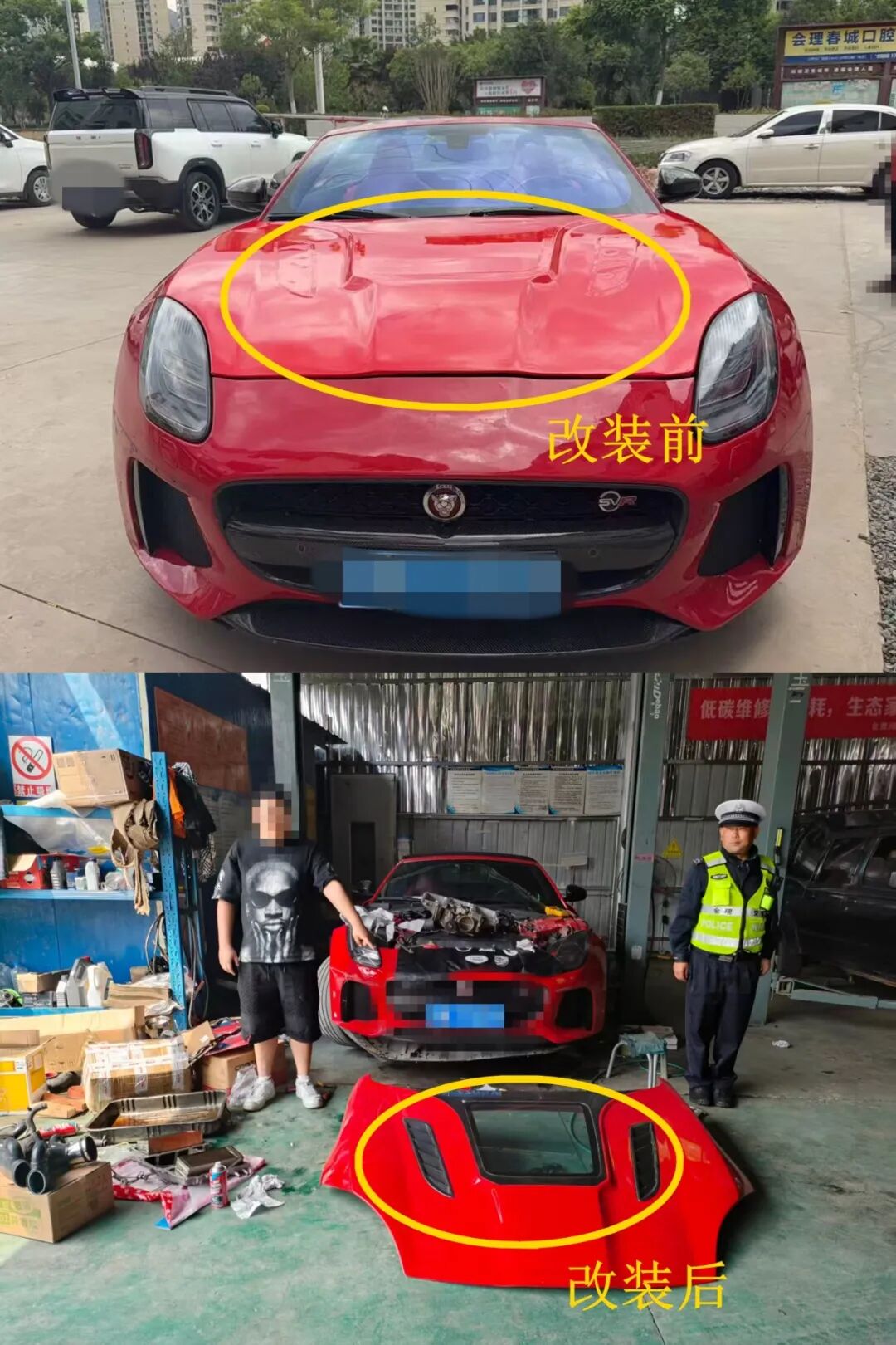 近日,会理市公安局交通管理大队在开展视频巡查工作中发现预警信息,川W***SV号小型汽车与登记备案时外型不相符,存在改装嫌疑,会理市公安局交通管理大队立即对该车开展查缉。 经核查,驾驶人王某某擅自改装车辆引擎盖颜色,未按照规定时限办理变更登记;已违反《中华人民共和国道路交通安全法实施条例》第六条第一款、《机动车登记规定》第十六条第一项、第二项和第三项。 目前,会理市公安局已依法责令王某某立即拆除改装部件、恢复车辆原状,并对其处以200元罚款。(一)擅自改变车辆外廓尺寸原有的技术参数,其突出部位易刮擦其他车辆及行人。 (二)更换、加亮氙气大灯,可能造成对向车道内车辆驾驶人以及同向前车驾驶人视觉短暂失明,存在道路交通安全隐患。 (三)改变转向灯颜色、改装刹车灯为闪烁形式、灯罩贴膜等,容易导致其他交通参与者误解车辆发出的信号,引发交通事故。 (四)改变车辆发动机输出功率,不仅会造成强烈的噪声污染,还容易导致车体发生自燃。 (五)改装排气系统的消音器,不仅噪音大、污染重,还会干扰其他交通参与者,易发生危险。