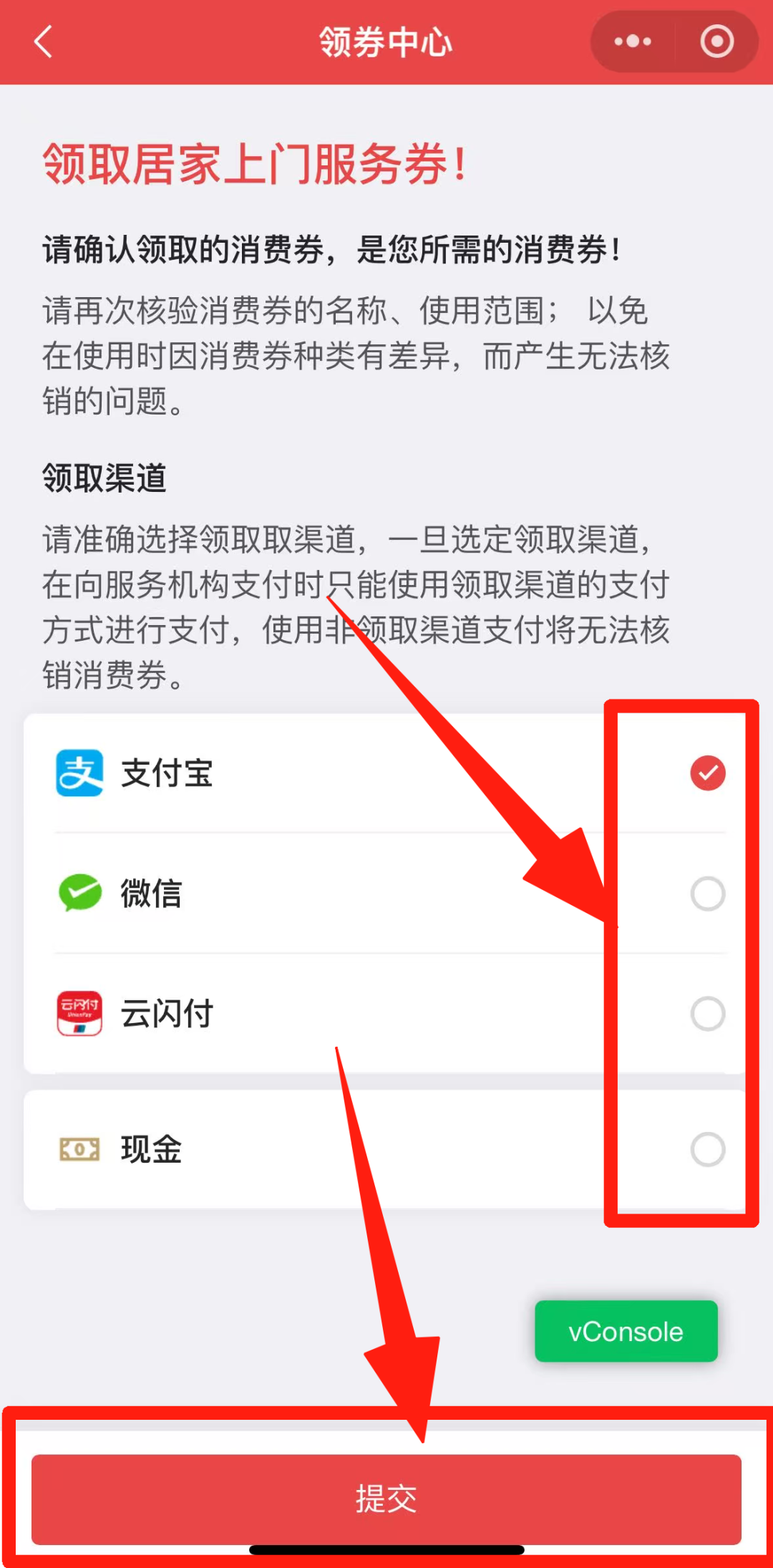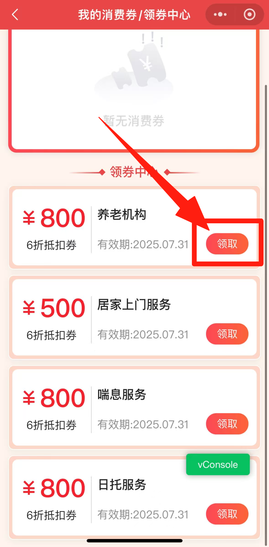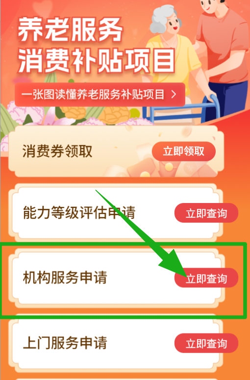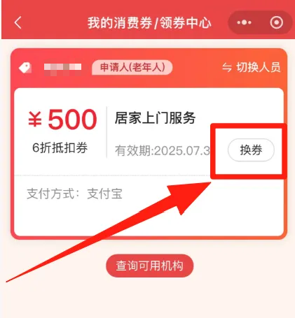 待评估机构受理后,开展评估服务。 首页点击进入“养老服务消费券补贴项目”,选择“消费券领取”,点击“立即领取”,选择自己要申领的消费券点击“领取”,选择“支付宝、微信、云闪付等领取渠道”,最后点击“提交”。 注意:每位老年人在同一月内仅可领取某一类电子消费券一张,不同类的电子消费券不能重复领取、叠加使用。 领取成功后,在“养老服务消费券补贴项目”专栏,点击“自己需要的服务”,点击“立即查询”,在查询结果页面中选择一个服务机构,进入该机构页面后点击“服务申请”,填写服务内容、服务时间,点击“提交”,等待服务机构审核。 在“我的”页面,点击“我的预约”,可查询到自己提交的预约记录。 服务完成后,在“我的”页面点击“我的服务”可以查询服务记录;点击“去评价”,可对服务机构和服务人员进行评价。 服务结束后,在支付费用时,电子消费券直接抵扣实际应付金额的40%,个人再向服务机构自付60%的费用(线上支付或现金支付均可)。 在“民政通”首页点击进入“养老服务消费券补贴项目”,点击“消费券领取”,点击“换券”,点击“确认”更换此消费券,完成消费券抵扣步骤。